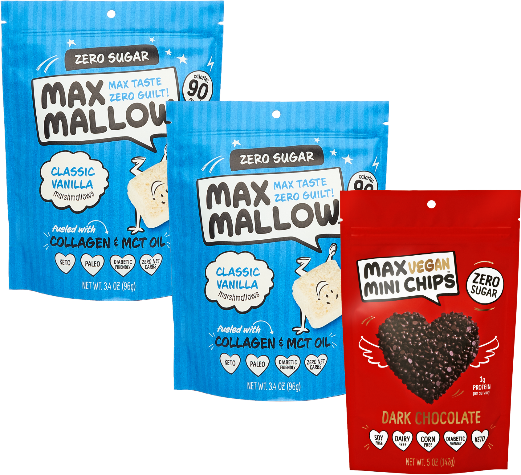 This 3-bag bundle includes 2 bags of Sugar-Free Classic Vanilla Marshmallows and 1 bag of Sugar-Free Chocolate Chips.